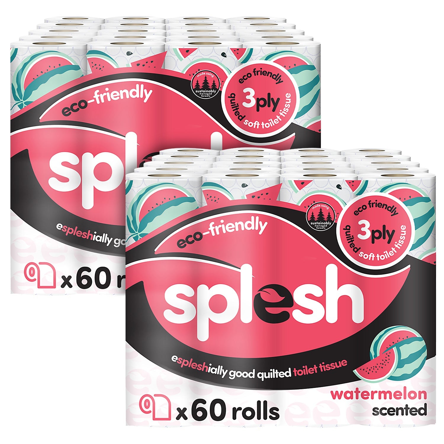 Splesh is thicker and stronger our 3-Ply toilet rolls are made from 3 layers of super-soft white tissue paper. Each loo roll is luxuriously quilted and embossed to ensure comfort, strength and provide maximum absorption.
